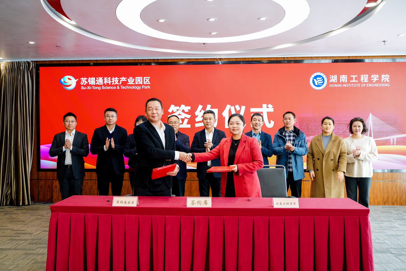 考察期间,胡慧一行先后走进苏锡通园区规划展示馆、政务服务中心及惠立学校,全方位了解园区在高端制造、电子信息等领域的产业布局,以及在优化营商环境、完善教育配套、保障人才发展等方面的创新举措与长远规划。座谈会上,双方围绕人才培养、科研转化、资源共享等核心议题深入磋商,达成广泛共识,并正式签署战略合作协议。此次签约标志着学院与园区迈入全方位、深层次合作新阶段,未来双方将重点聚焦实习实训基地共建、科研成果落地转化、高技能人才定向输送等领域,构建校地协同发展新格局。