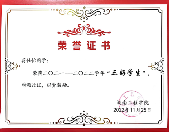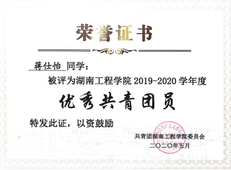 升升如阳,煦煦山立。积极参加志愿服务、文体比赛等课外活动,作为蓝信封通信大使通过书信来陪伴留守儿童的成长、定期前往湘潭大桥社区看望老人、参加全国大学生环保知识竞赛并荣获优秀奖。