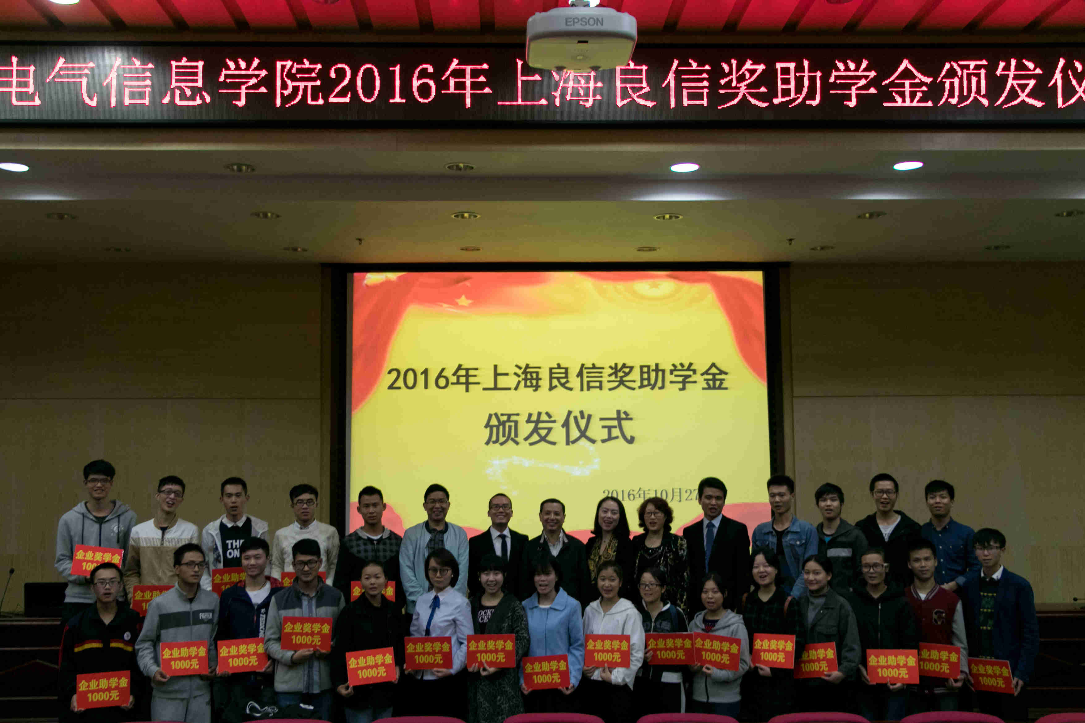 2016年10月27日下午三点,电气信息学院上海良信奖助学金颁发仪式在图书馆二报告厅隆重举行。上海良信电器股份有限公司客户服务部总监李晨辉、人力资源及行政部经理许莉、长沙办事处销售工程师李仑、电气信息学院院长...